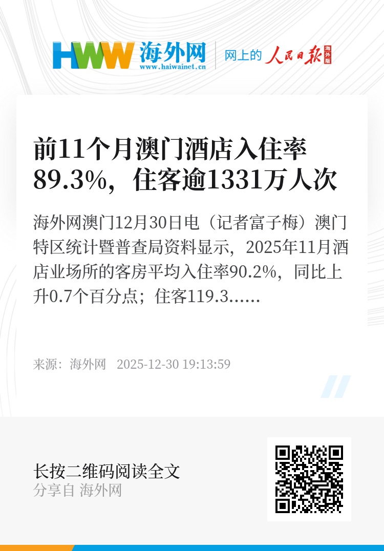 海外网澳门12月30日电(记者富子梅)澳门特区统计暨普查局资料显示,2025年11月酒店业场所的客房平均入住率90.2%,同比上升0.7个百分点;住客119.3万人次,增加1.9%。前11个月酒店客房平均入住率89.3%,同比上升3.2个百分点,住客1331.3万人次,增加0.6%,平均留宿时间1.7晚。