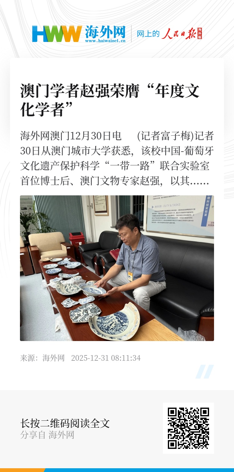 海外网澳门12月30日电 (记者富子梅)记者30日从澳门城市大学获悉,该校中国-葡萄牙文化遗产保护科学“一带一路”联合实验室首位博士后、澳门文物专家赵强,以其在海丝文化与外销瓷研究领域的突出成就,荣膺首届年度艺术榜单“年度文化学者”称号。据悉,赵强是该榜单中唯一来自港澳特区的专家学者。