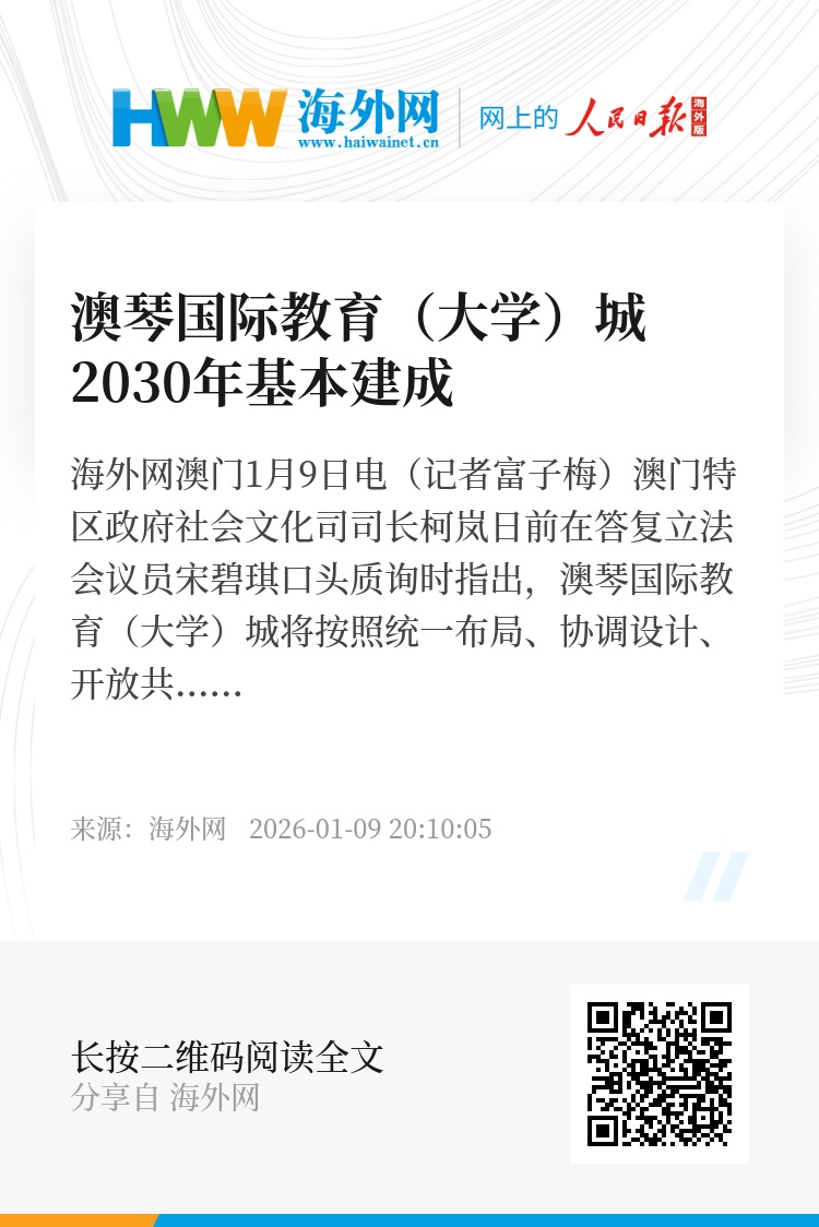 海外网澳门1月9日电(记者富子梅)澳门特区政府社会文化司司长柯岚日前在答复立法会议员宋碧琪口头质询时指出,澳琴国际教育(大学)城将按照统一布局、协调设计、开放共享的原则,分三期开发建设,2030年基本建成。自2025年起,有序开展各项工作,学生规模分年逐步增至2万人以上。