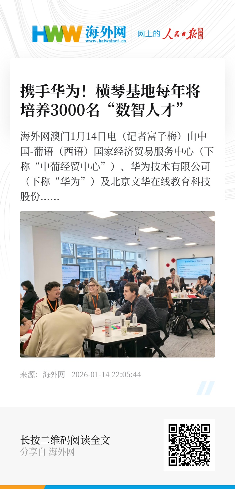 海外网澳门1月14日电(记者富子梅)由中国-葡语(西语)国家经济贸易服务中心(下称“中葡经贸中心”)、华为技术有限公司(下称“华为”)及北京文华在线教育科技股份有限公司(下称 “文华在线”)共同打造的横琴国际数智人才培养基地(下称“基地”)12日正式启动试运营,并举行首期课程开班仪式。这标志着中葡经贸中心在推动跨境合作、促进葡西语国家业务拓展及人才培养方面迈出新步伐。