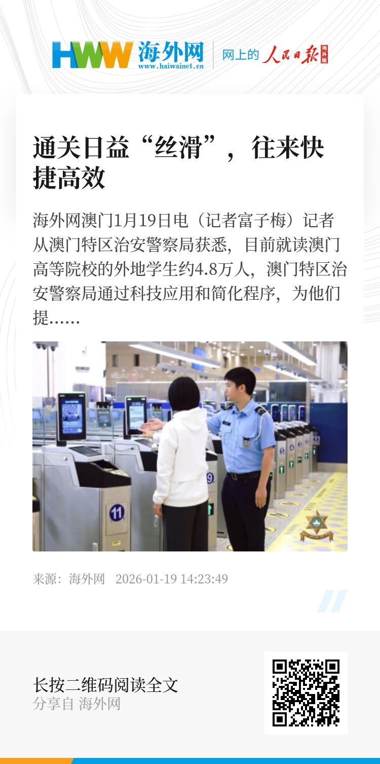 海外网澳门1月19日电(记者富子梅)记者从澳门特区治安警察局获悉,目前就读澳门高等院校的外地学生约4.8万人,澳门特区治安警察局通过科技应用和简化程序,为他们提供便捷高效的出入境通关和办证服务。同学们的普遍印象是“通关日益‘丝滑’,往来澳门快捷高效。”