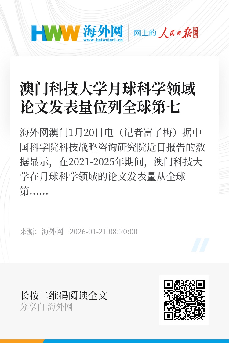 海外网澳门1月20日电(记者富子梅)据中国科学院科技战略咨询研究院近日报告的数据显示,在2021-2025年期间,澳门科技大学在月球科学领域的论文发表量从全球第13位跃升至第7位,成功跻身世界前十。这一核心科研产出指标的跨越式发展,标志着澳科大在该领域已建立起国际一流的学术创新能力,为其在国家深空探测宏伟蓝图中扮演更关键角色奠定了坚实基础。