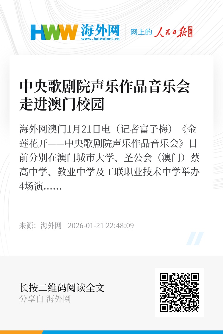 据悉,《金莲花开——中央歌剧院声乐作品音乐会》是“中华文化演出季”的系列演出。“中华文化演出季”致力将国家级舞台艺术带入澳门校园,去年12月,国家京剧院“京剧走进校园”活动吸引逾600名学生参与。北京人民艺术剧院《霸王别姬》及宁波市演艺集团《花木兰》等剧目也将于近期陆续走进澳门校园。此外,演出季期间举办的青年演员对谈、社区演出、工作坊等系列活动将达50场,持续丰富澳门师生与市民的艺术生活,让中华优秀文化在澳门扎根绽放。