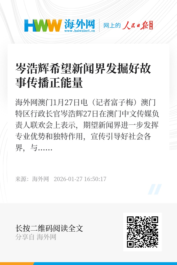 海外网澳门1月27日电(记者富子梅)澳门特区行政长官岑浩辉27日在澳门中文传媒负责人联欢会上表示,期望新闻界进一步发挥专业优势和独特作用,宣传引导好社会各界,与特区政府合力推进落实习主席重要指示精神和中央战略部署;继续关注和支持特区政府各范畴工作,及时反映社会民情、提出宝贵建议,传播正能量、发出“好声音”,作为公众与政府之间的桥梁,助力维护澳门特区长期繁荣稳定,弘扬爱国爱澳光荣传统。