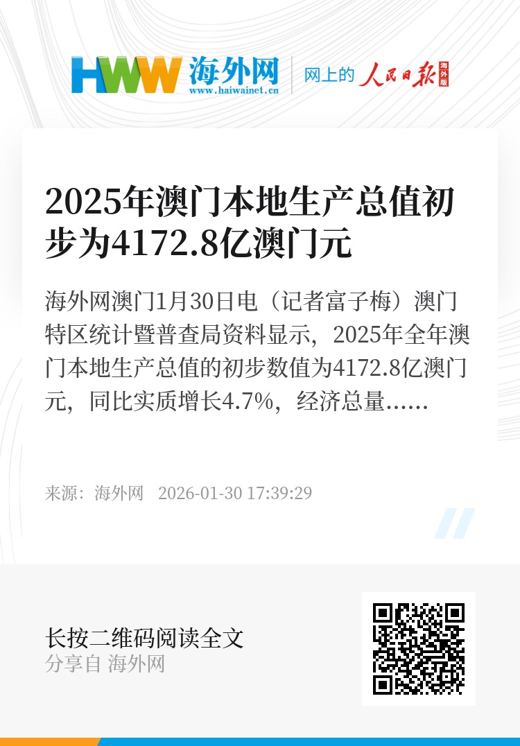 海外网澳门1月30日电(记者富子梅)澳门特区统计暨普查局资料显示,2025年全年澳门本地生产总值的初步数值为4172.8亿澳门元,同比实质增长4.7%,经济总量恢复至2019年的89.6%。