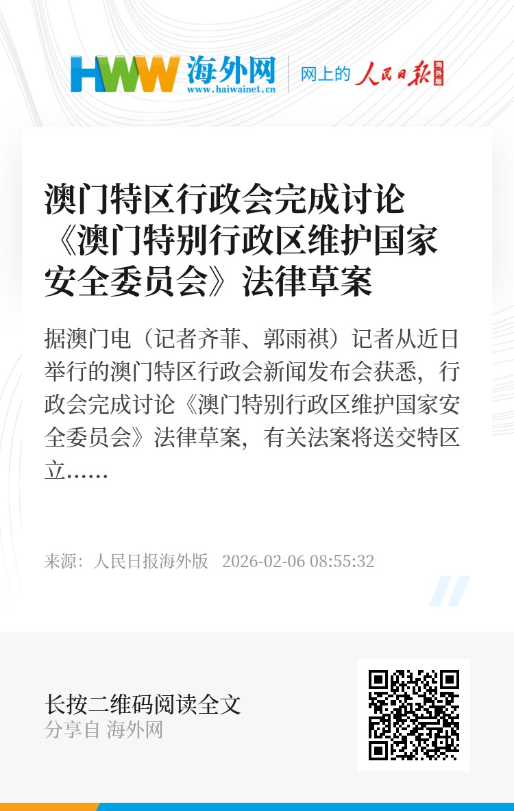 据新华社澳门电(记者齐菲、郭雨祺)记者从近日举行的澳门特区行政会新闻发布会获悉,行政会完成讨论《澳门特别行政区维护国家安全委员会》法律草案,有关法案将送交特区立法会审议。