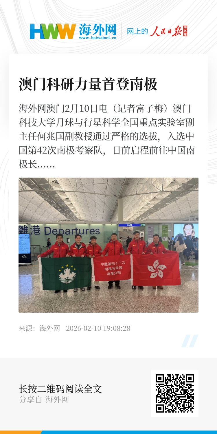 海外网澳门2月10日电(记者富子梅)澳门科技大学月球与行星科学全国重点实验室副主任何兆国副教授通过严格的选拔,入选中国第42次南极考察队,日前启程前往中国南极长城站执行科考任务。这是澳门特区科研人员首次参与国家极地科学考察工作,标志着澳门在国家重大科学探索事业中的深度融入与贡献。