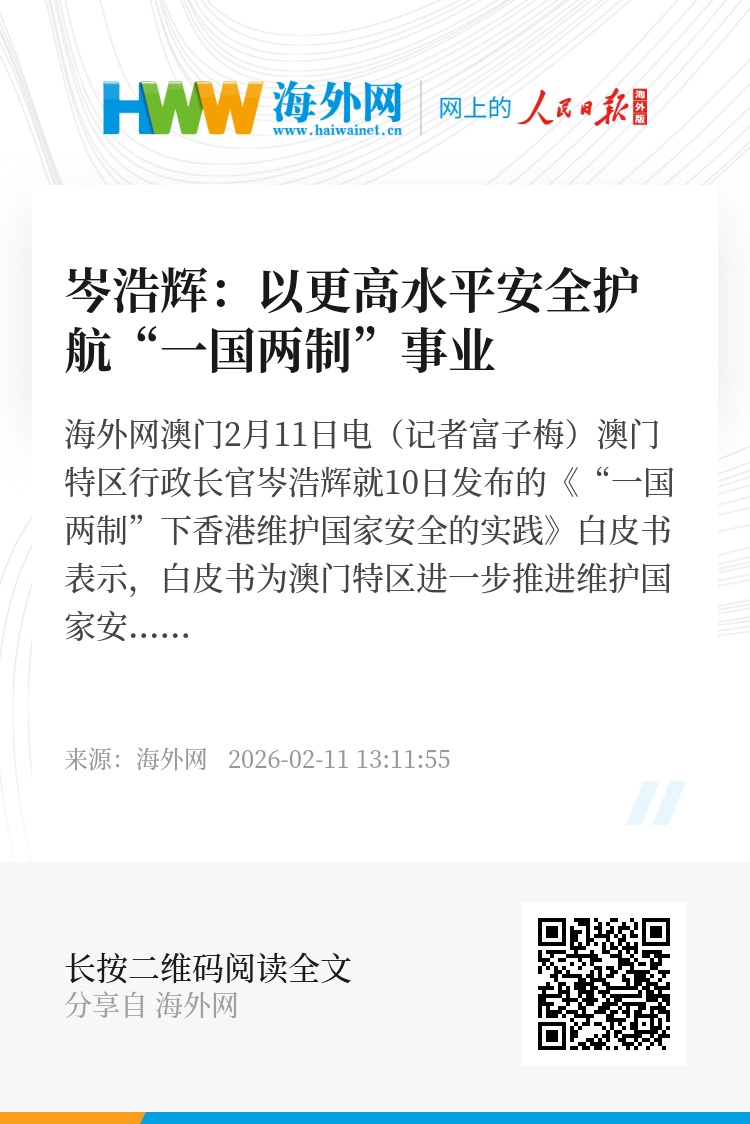 海外网澳门2月11日电(记者富子梅)澳门特区行政长官岑浩辉就10日发布的《“一国两制”下香港维护国家安全的实践》白皮书表示,白皮书为澳门特区进一步推进维护国家安全工作指明方向,特区政府将继续秉持总体国家安全观,稳步推进国家安全体制机制建设,适时完善相关法规,确保澳门长期繁荣稳定,以更高水平安全护航“一国两制”事业高质量发展。
