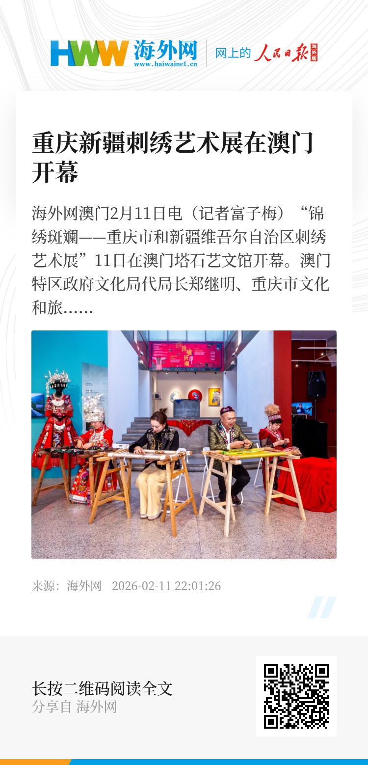刺绣艺术是中华民族最具代表性的优秀传统手工艺之一,蕴含深厚的历史底蕴与丰富的艺术创意,不同地域民族创作的艺术绣品风格各异。郑继明表示,展览精选重庆与新疆两地多项非遗刺绣艺术,让澳门市民及游客了解两地独特的民俗文化,共同传承弘扬中华优秀传统文化。