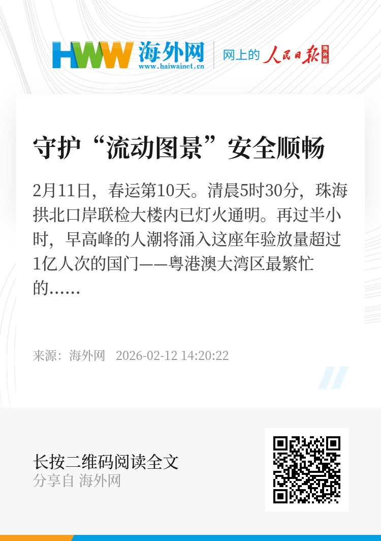 就在刚刚过去的首个春运周末,珠海拱北口岸连续刷新纪录:2月7日客流达46.3万人次,创6年多来新高;珠海边检总站当日查验珠海各口岸的客流总量达83.9万人次,创历史新高。数据背后,是湾区“一小时生活圈”越织越密,“一国两制”澳珠双城往来日益便利。(富子梅 张子恒)