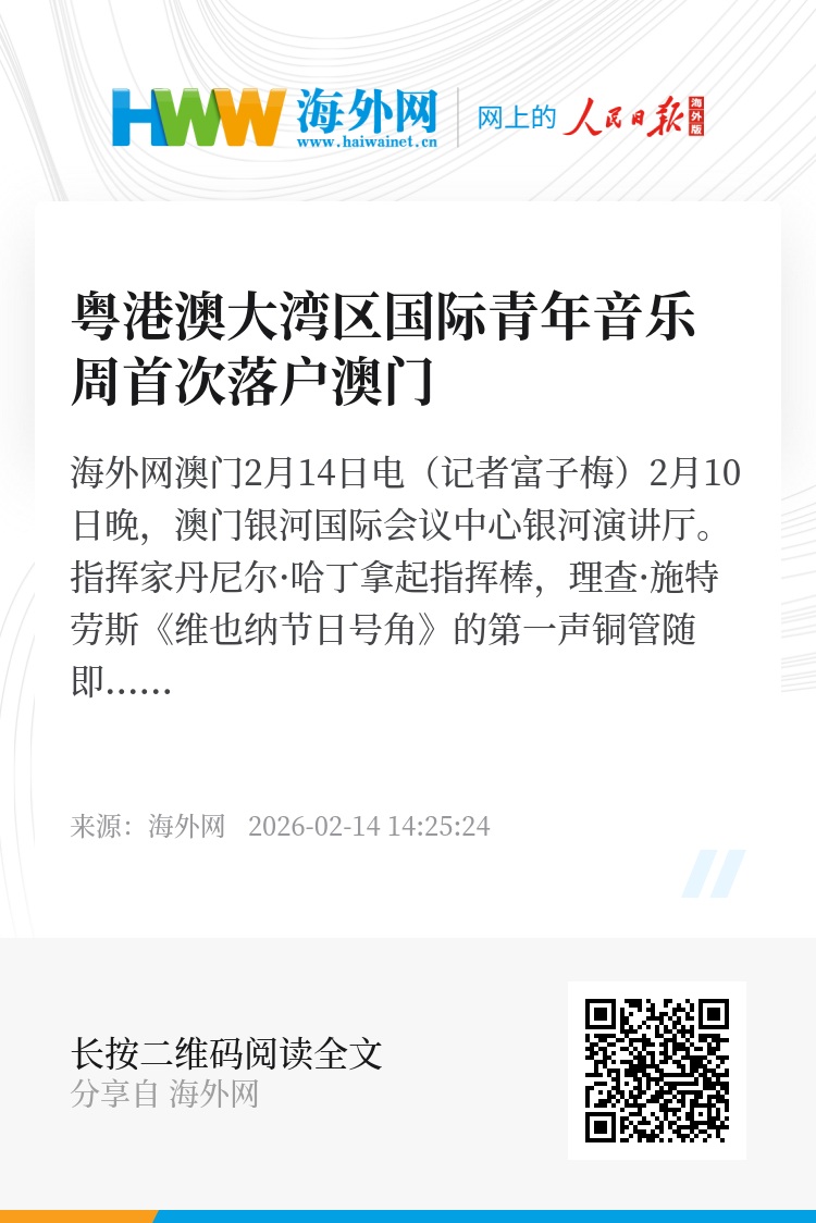 海外网澳门2月14日电(记者富子梅)2月10日晚,澳门银河国际会议中心银河演讲厅。指挥家丹尼尔·哈丁拿起指挥棒,理查·施特劳斯《维也纳节日号角》的第一声铜管随即在澳门初春的夜空荡开。12位青年演奏家与导师汉内斯·劳宾联袂,圆号、小号、长号、大号、定音鼓绕梁。为期三天的“银河娱乐集团呈献:2026粤港澳大湾区国际青年音乐周”首次在澳门奏响。