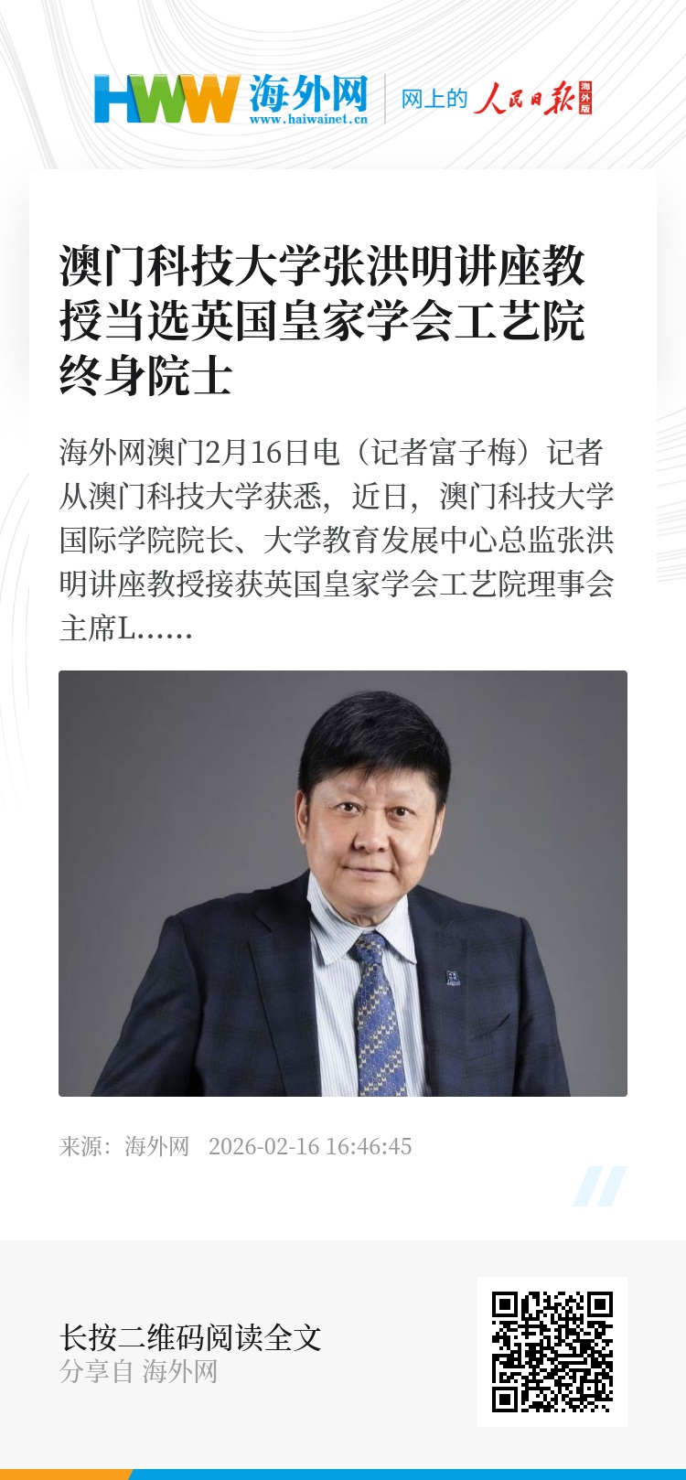 海外网澳门2月16日电(记者富子梅)记者从澳门科技大学获悉,近日,澳门科技大学国际学院院长、大学教育发展中心总监张洪明讲座教授接获英国皇家学会工艺院理事会主席Loyd Grossman爵士的信函,颁授张洪明讲座教授为英国皇家学会工艺院终身院士。这不仅是对其学术地位和影响力的认可,也是对澳门科技大学在人文社科领域的肯定。