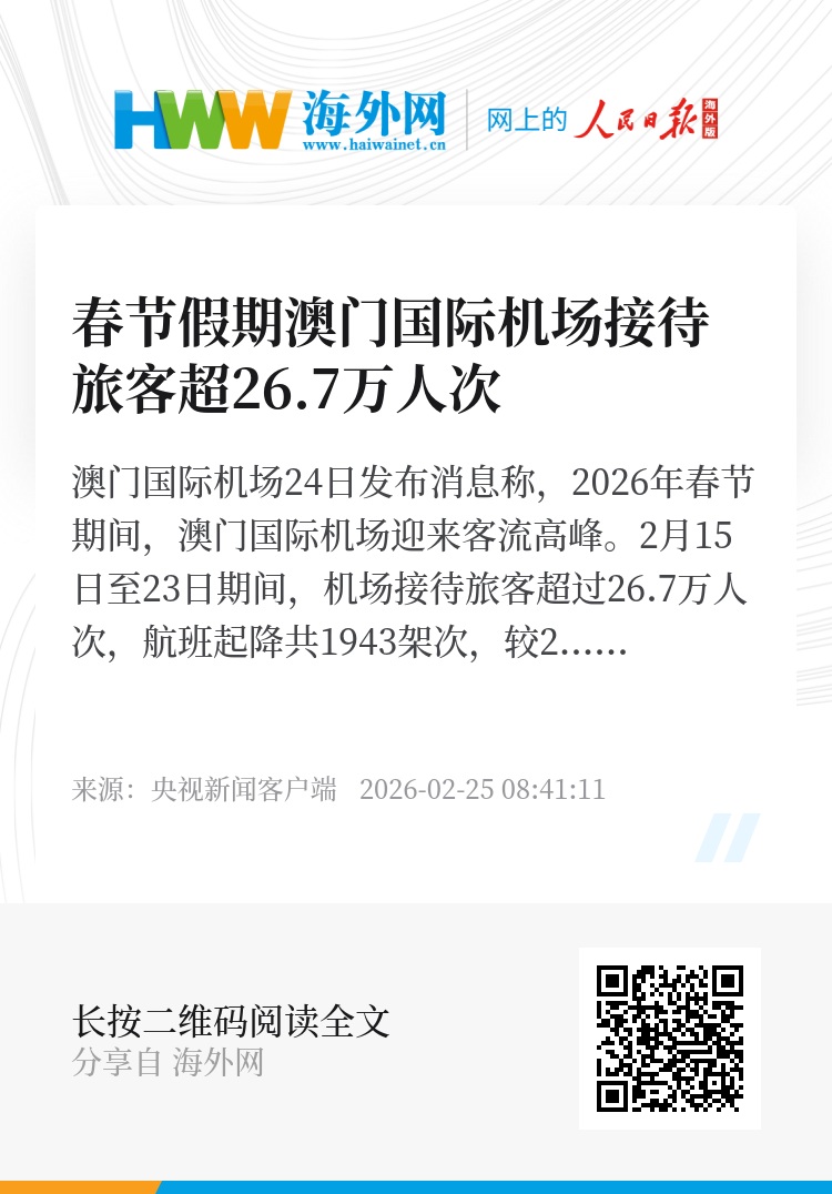 澳门国际机场24日发布消息称,2026年春节期间,澳门国际机场迎来客流高峰。2月15日至23日期间,机场接待旅客超过26.7万人次,航班起降共1943架次,较2025年春节同期分别增长11%及9%。其中,旅客高峰出现在2月21日和22日两天,单日旅客量分别达2.9万及2.8万人次。