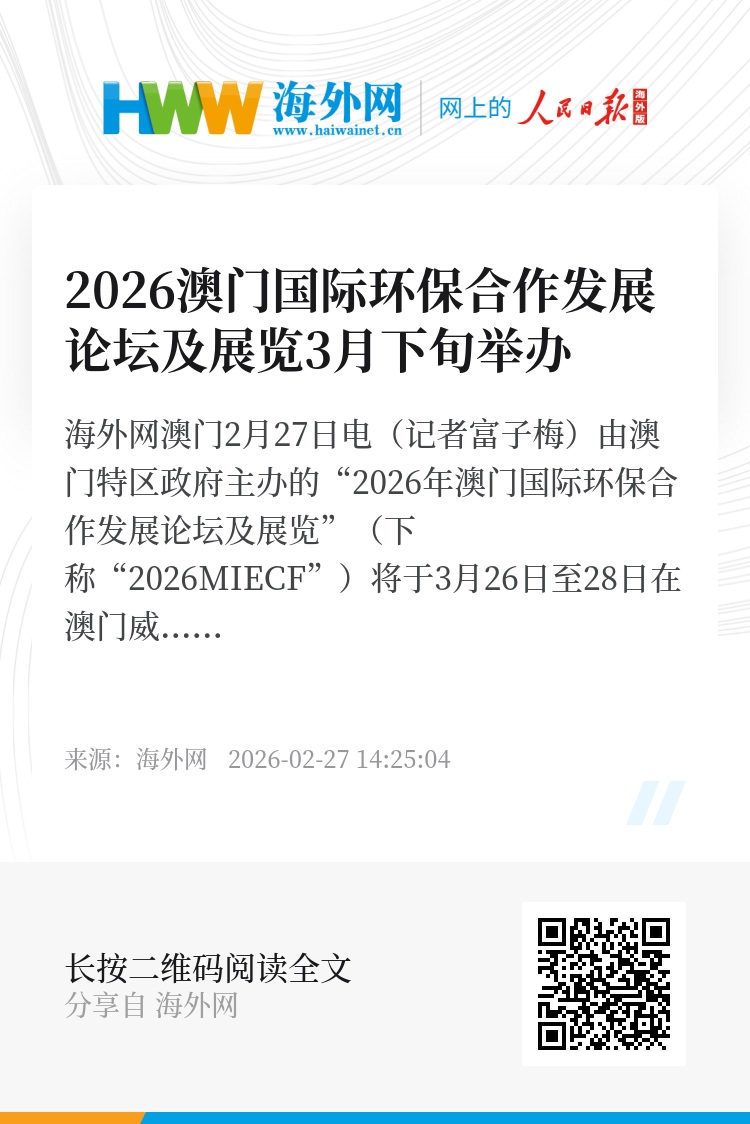 海外网澳门2月27日电(记者富子梅)由澳门特区政府主办的“2026年澳门国际环保合作发展论坛及展览”(下称“2026MIECF”)将于3月26日至28日在澳门威尼斯人金光会展举行。以“低碳无废城市 全球协力启航”为主题,通过“绿色论坛”迭加升级“绿色展览”、延伸“绿色服务”,推动低碳无废城市建设,促进绿色技术交流与拓展市场商机,助力澳门成为区域性的绿色发展与绿色商机高地。