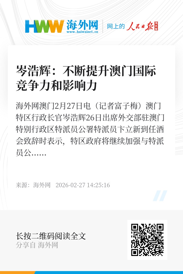 海外网澳门2月27日电(记者富子梅)澳门特区行政长官岑浩辉26日出席外交部驻澳门特别行政区特派员公署特派员卞立新到任酒会致辞时表示,特区政府将继续加强与特派员公署的沟通对接,期望公署一如既往指导、支持和协助特区开展各项工作,共同将澳门打造成为国家高水平对外开放重要的桥头堡和中西文明交流互鉴的重要窗口,不断提升澳门的国际竞争力和影响力。