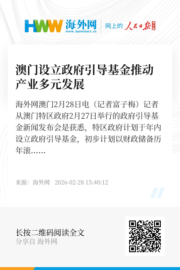 海外网澳门2月28日电(记者富子梅)记者从澳门特区政府2月27日举行的政府引导基金新闻发布会是获悉,特区政府计划于年内设立政府引导基金,初步计划以财政储备历年滚存的收益向基金注资110亿澳门元,联同首批社会资本设立引导基金,预期规模为200亿澳门元,期望发挥引领作用,汇集和引导社会资本参与投资重点产业和项目,扎实推动经济适度多元发展。