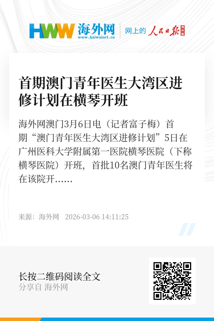 海外网澳门3月6日电(记者富子梅)首期“澳门青年医生大湾区进修计划”5日在广州医科大学附属第一医院横琴医院(下称横琴医院)开班,首批10名澳门青年医生将在该院开展临床进修学习,推进琴澳医学人才融合培养。