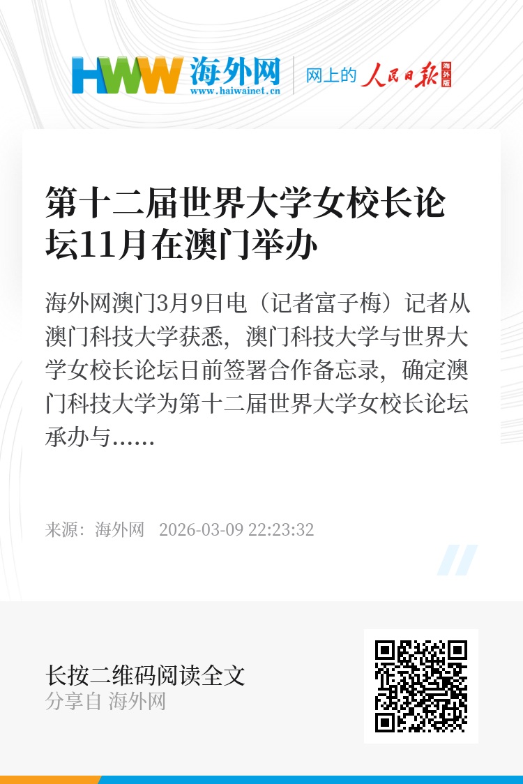海外网澳门3月9日电(记者富子梅)记者从澳门科技大学获悉,澳门科技大学与世界大学女校长论坛日前签署合作备忘录,确定澳门科技大学为第十二届世界大学女校长论坛承办与合办单位。论坛将于2026年11月12日至16日在澳门举行。