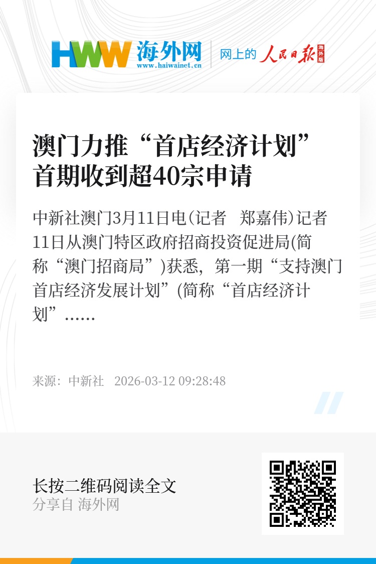 中新社澳门3月11日电(记者 郑嘉伟)记者11日从澳门特区政府招商投资促进局(简称“澳门招商局”)获悉,第一期“支持澳门首店经济发展计划”(简称“首店经济计划”)共接获逾600宗咨询并收到40多宗申请,基本实现预期目标。