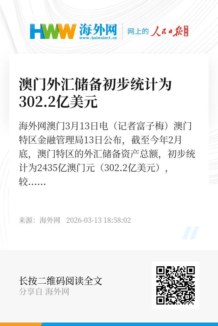 海外网澳门3月13日电(记者富子梅)澳门特区金融管理局13日公布,截至今年2月底,澳门特区的外汇储备资产总额,初步统计为2435亿澳门元(302.2亿美元),较今年1月经修订总额2418亿澳门元(300.8亿美元)上升了0.7%。