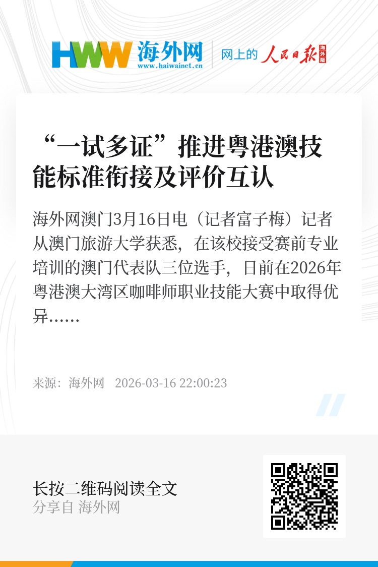 海外网澳门3月16日电(记者富子梅)记者从澳门旅游大学获悉,在该校接受赛前专业培训的澳门代表队三位选手,日前在2026年粤港澳大湾区咖啡师职业技能大赛中取得优异成绩,同步获得内地职业技能等级证书及澳门职业技能证明,合资格选手还可获得“澳门职业技能认可基准”(MORS)证书,进一步体现粤港澳三地在技能标准衔接及评价互认方面的积极成果。