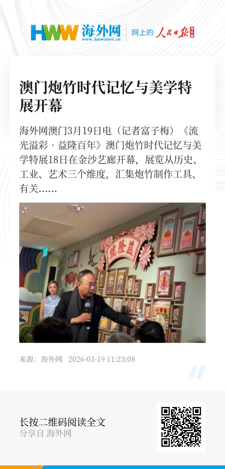 据悉,此次展览由金沙中国联动澳门科技大学图书馆及人文艺术学院共同推出,澳门博物馆、澳门档案馆提供历史展品及学术支持,同期在澳门科技大学展出《时代回响・粤东炮竹包装招纸展》,探索校企跨界深度协作。