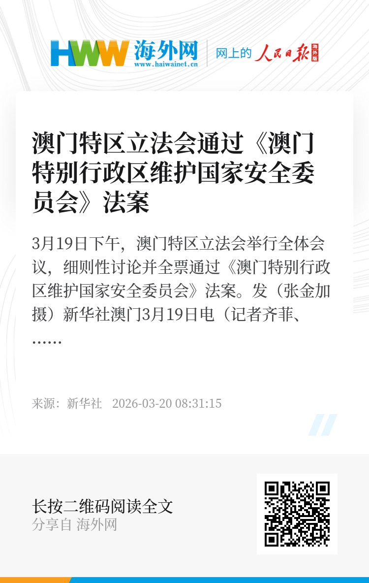 新华社澳门3月19日电(记者齐菲、宋晨)澳门特区立法会19日下午举行全体会议,细则性讨论并全票通过《澳门特别行政区维护国家安全委员会》法案。