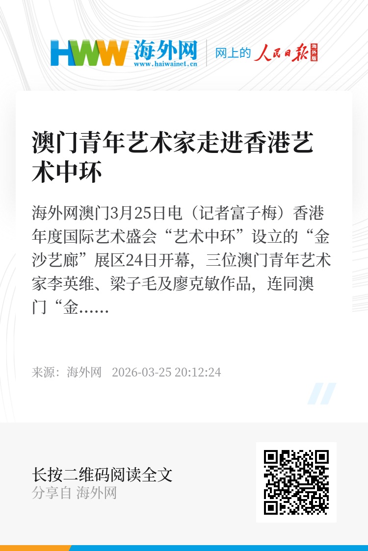 海外网澳门3月25日电(记者富子梅)香港年度国际艺术盛会“艺术中环”设立的“金沙艺廊”展区24日开幕,三位澳门青年艺术家李英维、梁子毛及廖克敏作品,连同澳门“金沙艺廊”正展出的《流光溢彩‧益隆百年》澳门炮竹时代记忆与美学特展的历史珍品,共同展示澳门历久弥新的艺术气韵,一起见证澳门艺术发展新的里程碑。