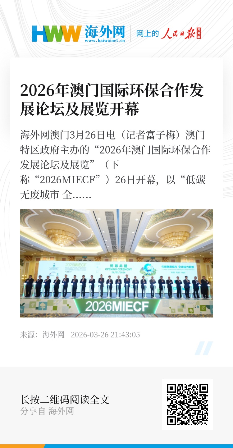 海外网澳门3月26日电(记者富子梅)澳门特区政府主办的“2026年澳门国际环保合作发展论坛及展览”(下称“2026MIECF”)26日开幕,以“低碳无废城市 全球协力启航”为主题,汇聚30个国家及地区的政府代表、知名环保专家学者、世界500强企业、国际环保组织以及环保科技领军企业等参展参会。为期3天的展会将举办近30场专题活动,推动国际绿色合作与产业对接,拓展澳门在区域及国际环保领域的角色与影响力。