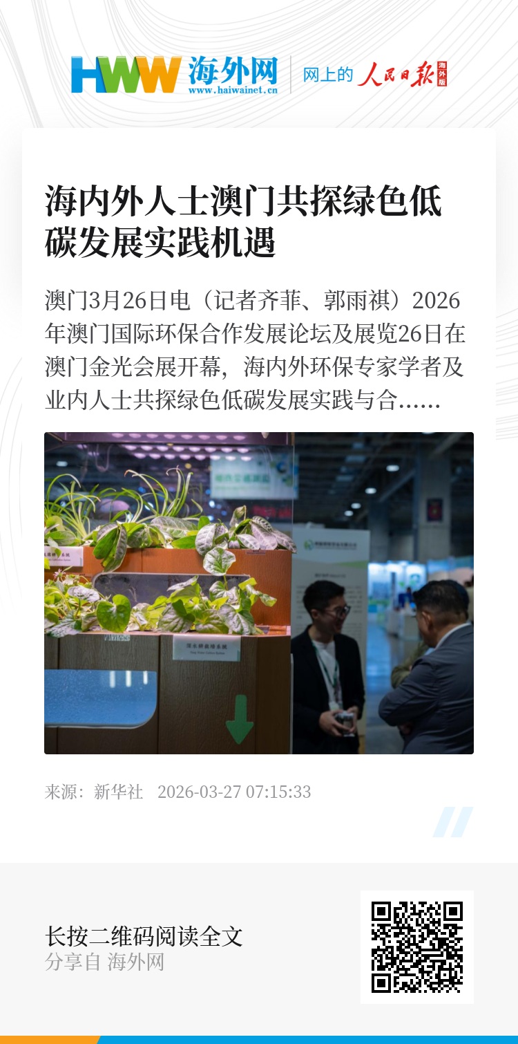 新华社澳门3月26日电(记者齐菲、郭雨祺)2026年澳门国际环保合作发展论坛及展览26日在澳门金光会展开幕,海内外环保专家学者及业内人士共探绿色低碳发展实践与合作机遇。