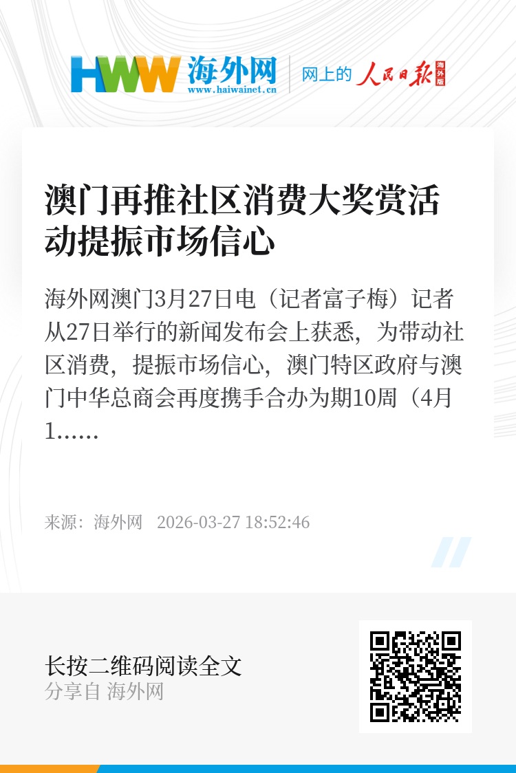 海外网澳门3月27日电(记者富子梅)记者从27日举行的新闻发布会上获悉,为带动社区消费,提振市场信心,澳门特区政府与澳门中华总商会再度携手合办为期10周(4月10日至6月18日)的“2026社区消费大奖赏”大型促消费活动,发放总值约4亿澳门元的消费优惠。