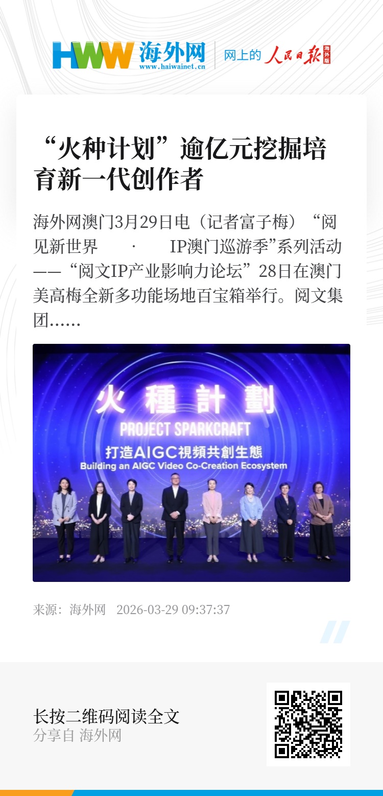 海外网澳门3月29日电(记者富子梅)“阅见新世界 • IP澳门巡游季”系列活动——“阅文IP产业影响力论坛”28日在澳门美高梅全新多功能场地百宝箱举行。阅文集团现场启动“火种计划”,面向个人创作者及小型工作室,投入逾1亿元,挖掘培育新一代创作者,支持人工智能生成内容(AIGC)视频产业与共创生态发展。