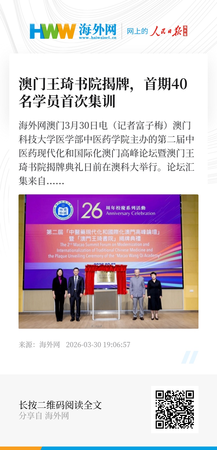 海外网澳门3月30日电(记者富子梅)澳门科技大学医学部中医药学院主办的第二届中医药现代化和国际化澳门高峰论坛暨澳门王琦书院揭牌典礼日前在澳科大举行。