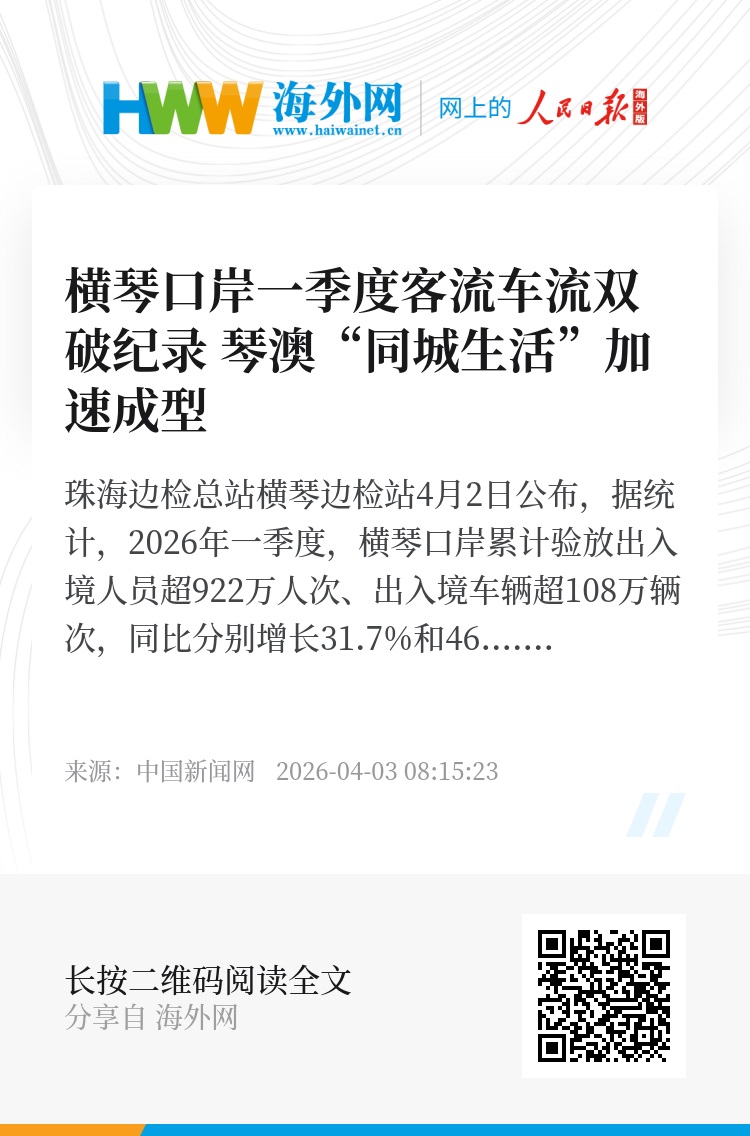 珠海边检总站横琴边检站4月2日公布,据统计,2026年一季度,横琴口岸累计验放出入境人员超922万人次、出入境车辆超108万辆次,同比分别增长31.7%和46.5%。客流与车流双双创下历史同期新高,彰显琴澳深度融合的强劲势头。