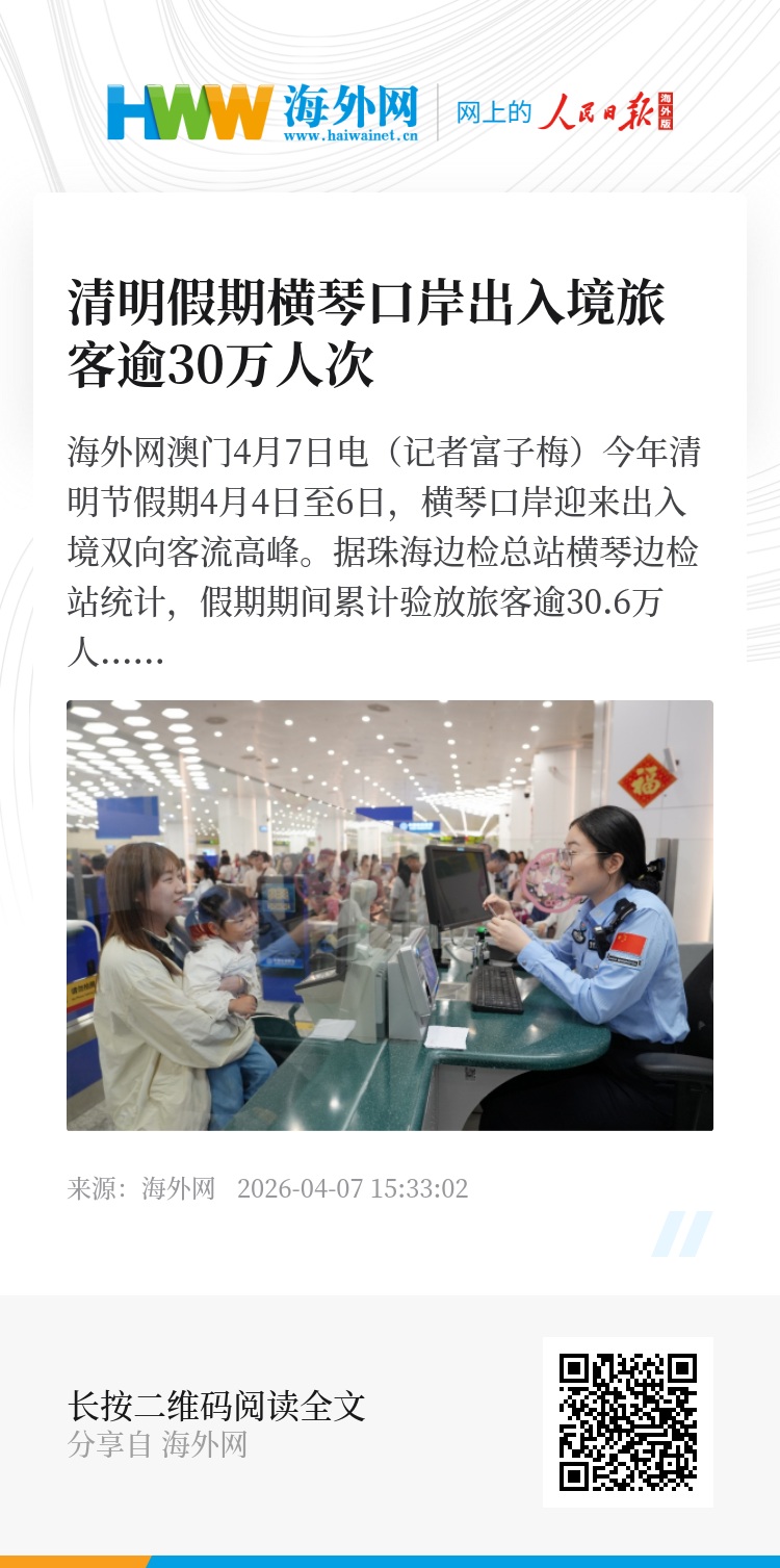 据悉,为应对节日客流高峰,琴澳两地联检单位密切联动,协同保障口岸运行安全、有序、高效。相关部门及时发布口岸通行信息,重点为返乡祭祖的港澳居民及海外侨胞提供通关指引。同时,提前开足查验通道,提升整体通关效率。