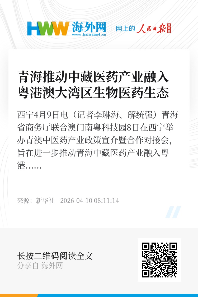 新华社西宁4月9日电(记者李琳海、解统强)青海省商务厅联合澳门南粤科技园8日在西宁举办青澳中医药产业政策宣介暨合作对接会,旨在进一步推动青海中藏医药产业融入粤港澳大湾区生物医药生态,让高原道地药材“借澳出海”,让澳门中医药产业“引青赋能”。