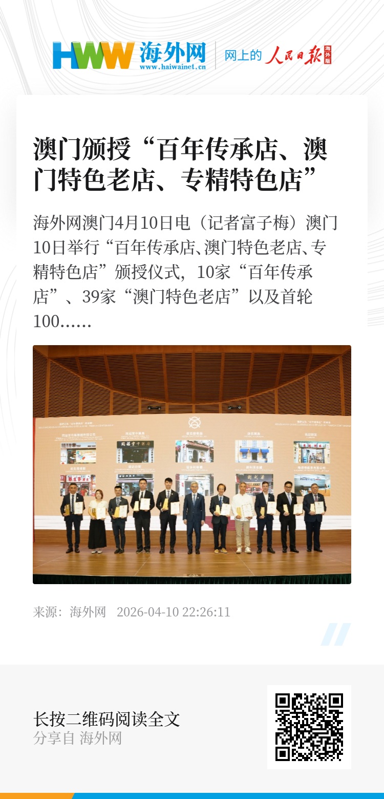 海外网澳门4月10日电(记者富子梅)澳门10日举行 “百年传承店、澳门特色老店、专精特色店”颁授仪式,10家“百年传承店”、39家“澳门特色老店”以及首轮100家“专精特色店”获颁牌匾及证书。三个品牌评定活动旨在发掘更多兼具特色技艺、匠心品质与市场潜力的中小商户,通过品牌认证与支持措施,助力企业提升服务与产品质量,增强市场竞争力。