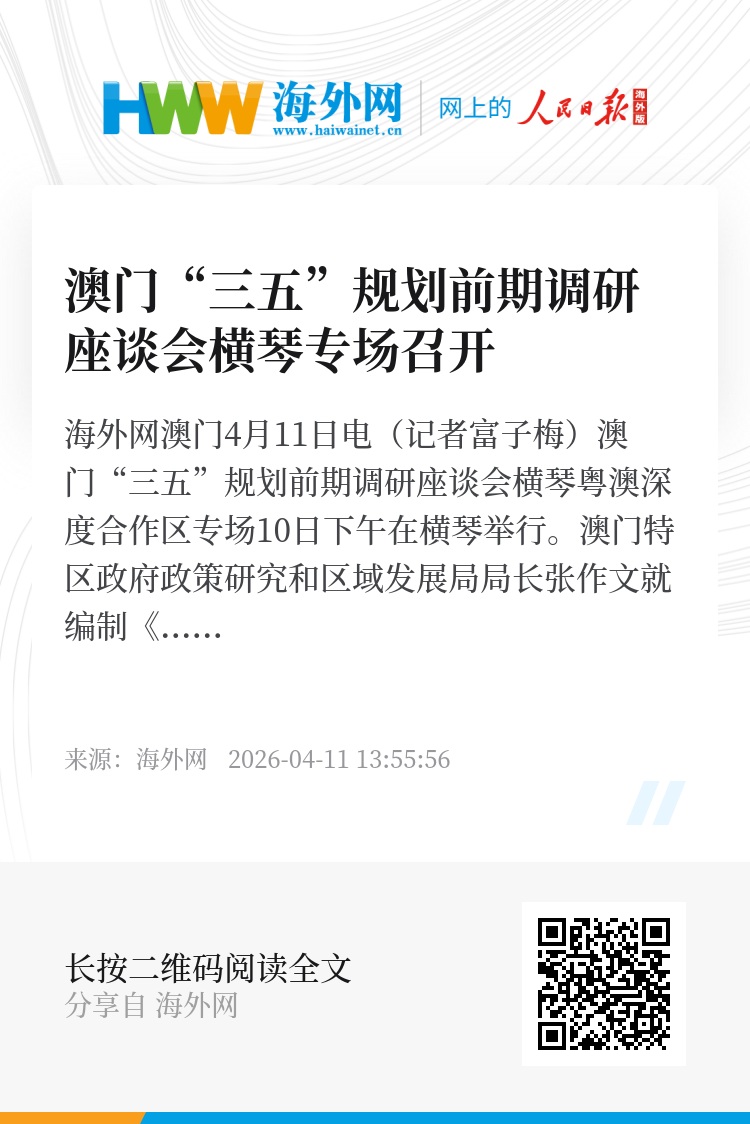海外网澳门4月11日电(记者富子梅)澳门“三五”规划前期调研座谈会横琴粤澳深度合作区专场10日下午在横琴举行。澳门特区政府政策研究和区域发展局局长张作文就编制《澳门特别行政区经济和社会发展第三个五年规划(2026—2030)》,听取横琴社会各界意见建议。来自合作区头部企业、澳资企业代表,以及在横琴生活居住、关心支持琴澳发展的澳门市民代表等与会,共同为高水平规划引领琴澳一体化高质量发展建真言、献良策。