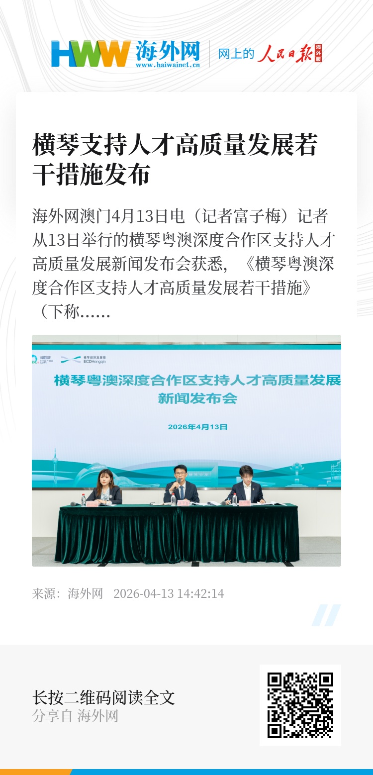 海外网澳门4月13日电(记者富子梅)记者从13日举行的横琴粤澳深度合作区支持人才高质量发展新闻发布会获悉,《横琴粤澳深度合作区支持人才高质量发展若干措施》(下称《若干措施》)及配套实施细则发布,全面升级合作区现有人才政策,从协同引才、构建载体、优化生态等维度,完善全生命周期人才服务体系,助力粤港澳大湾区高水平人才高地建设。同时,“天沐英才”全球人才访澳琴体验计划宣布启动,释放全球聚才的强烈信号。
