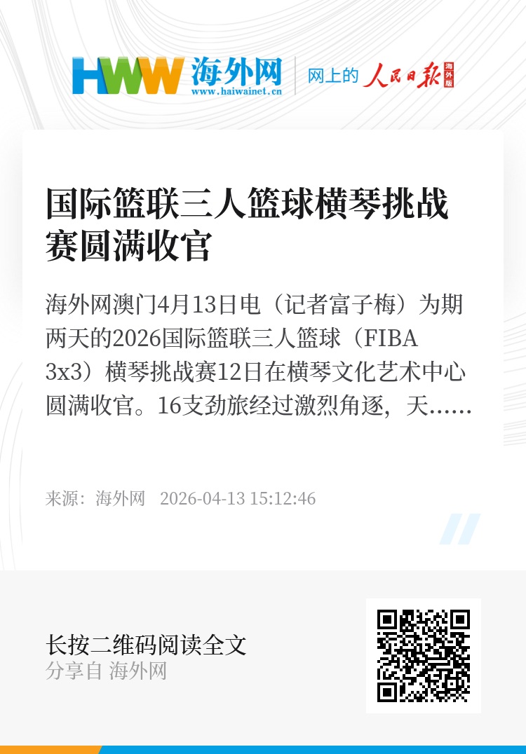海外网澳门4月13日电(记者富子梅)为期两天的2026国际篮联三人篮球(FIBA 3x3)横琴挑战赛12日在横琴文化艺术中心圆满收官。16支劲旅经过激烈角逐,天际线队在决赛中以15:12战胜利曼队,夺得2026国际篮联三人篮球赛季首个冠军。