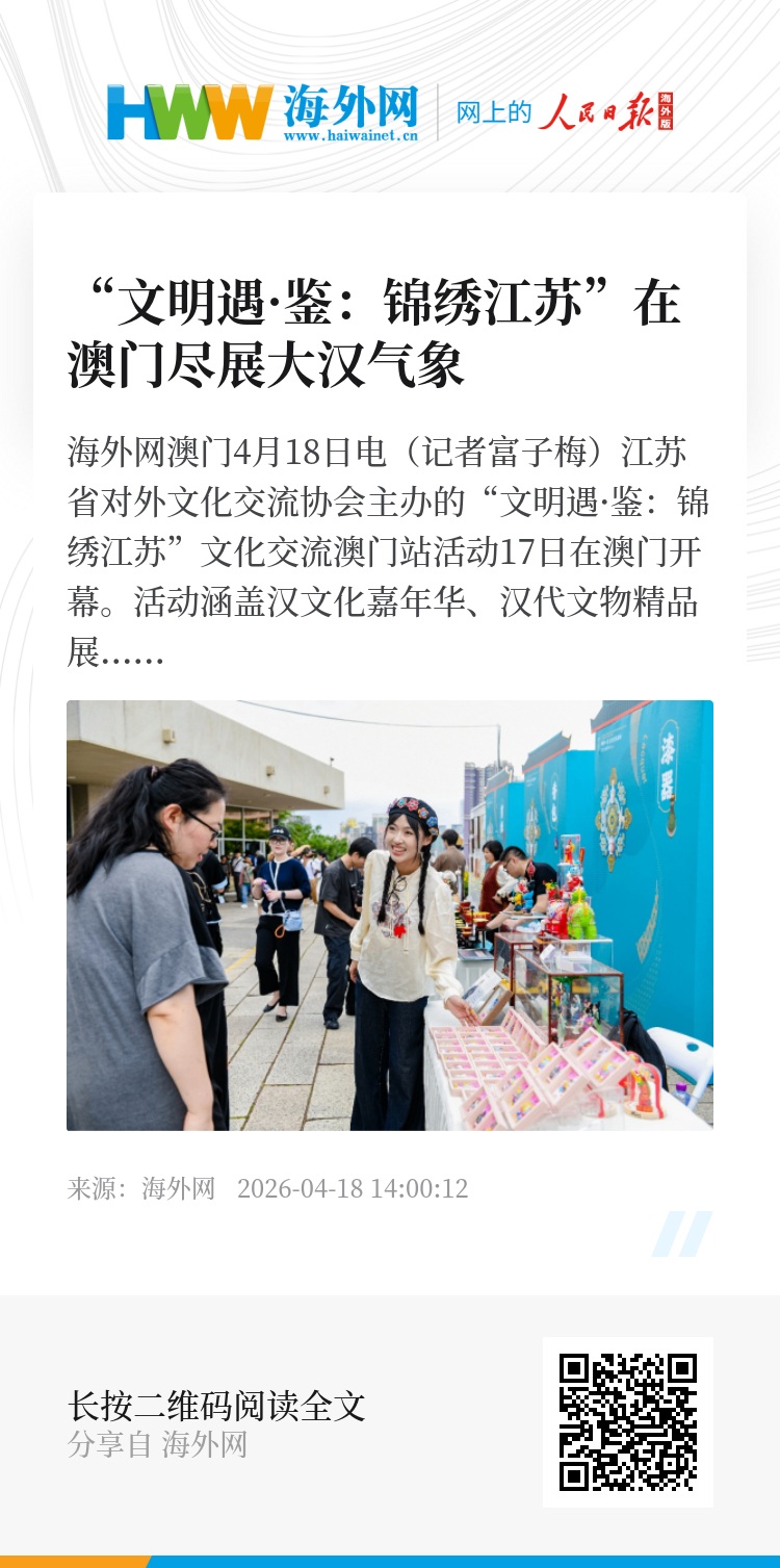 海外网澳门4月18日电(记者富子梅)江苏省对外文化交流协会主办的“文明遇·鉴:锦绣江苏”文化交流澳门站活动17日在澳门开幕。活动涵盖汉文化嘉年华、汉代文物精品展、汉文化进校园进社区等多个板块,全方位展示江苏徐州的文化底蕴与创新活力。