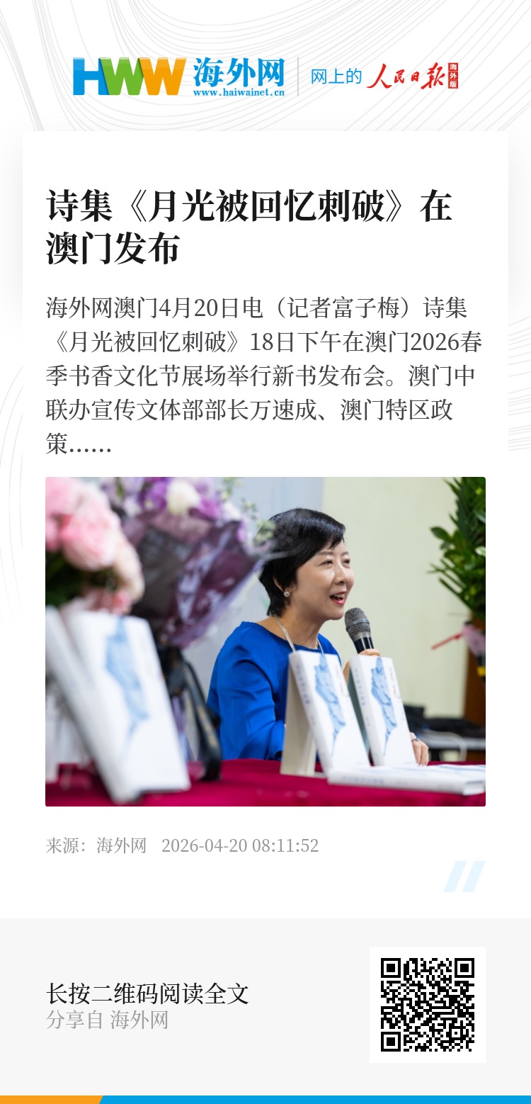 海外网澳门4月20日电(记者富子梅)诗集《月光被回忆刺破》18日下午在澳门2026春季书香文化节展场举行新书发布会。澳门中联办宣传文体部部长万速成、澳门特区政策研究和区域发展局局长张作文、澳门文教出版协会会长林发钦、中国工商银行(澳门)股份有限公司行政总裁牛建军、澳门湖北社团总会副会长祁维等出席主礼。