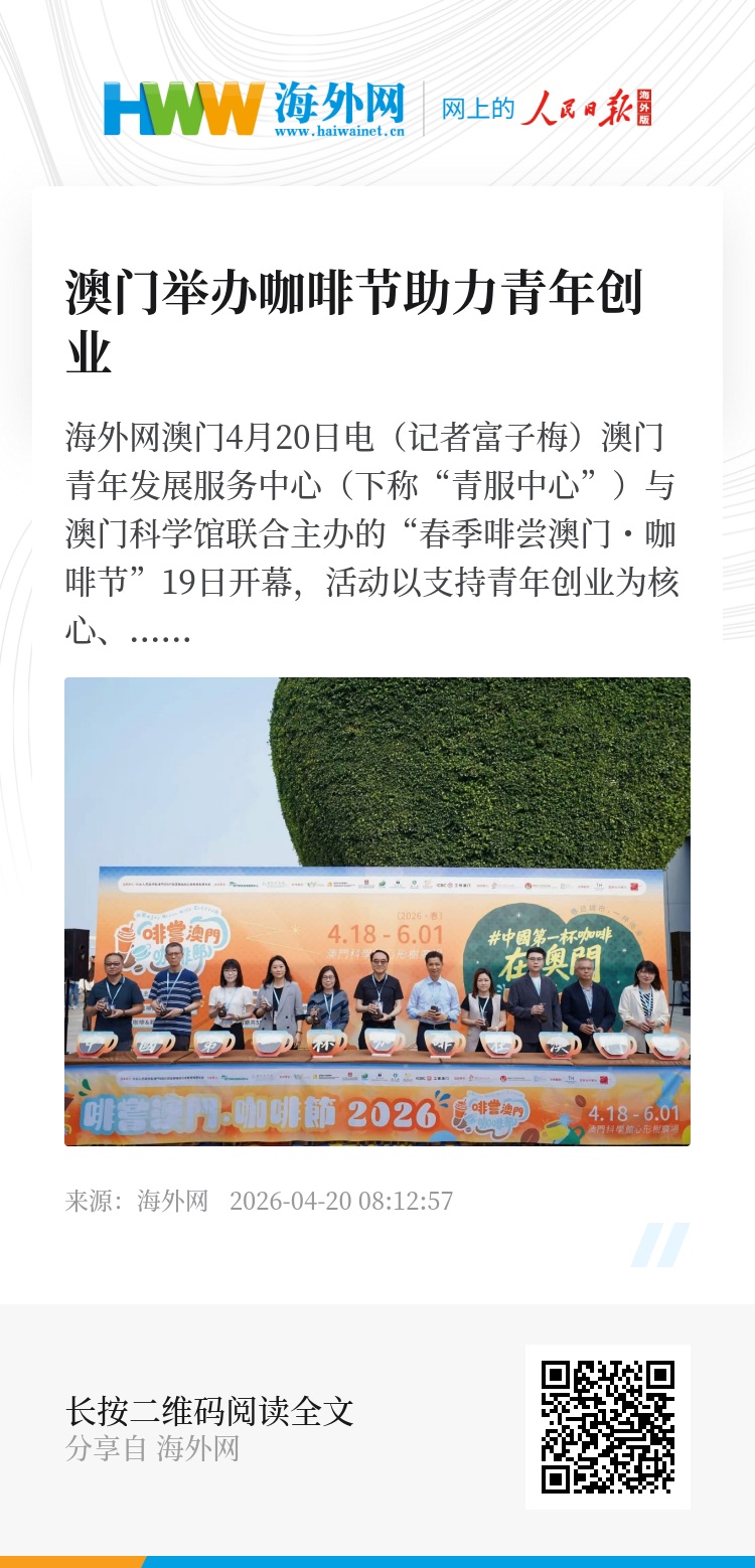 海外网澳门4月20日电(记者富子梅)澳门青年发展服务中心(下称“青服中心”)与澳门科学馆联合主办的“春季啡尝澳门・咖啡节”19日开幕,活动以支持青年创业为核心、以传承咖啡文化为宗旨,将持续至6月1日。澳门中联办教育和青年工作部部长李雪飞、澳门特区经济及科技发展局副局长郑晓敏、卫生局代副局长戴华浩、澳门科学馆副馆长张雄发、澳门青年发展服务中心总干事黄永曦等出席开幕式。