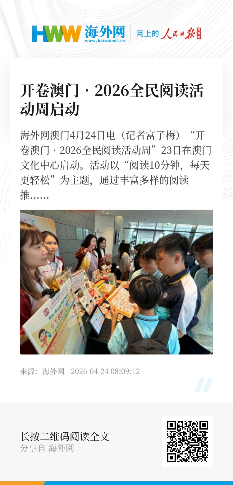 海外网澳门4月24日电(记者富子梅)“开卷澳门‧2026全民阅读活动周”23日在澳门文化中心启动。活动以“阅读10分钟,每天更轻松”为主题,通过丰富多样的阅读推广活动,鼓励市民将阅读融入日常,共建书香满溢的文化澳门。