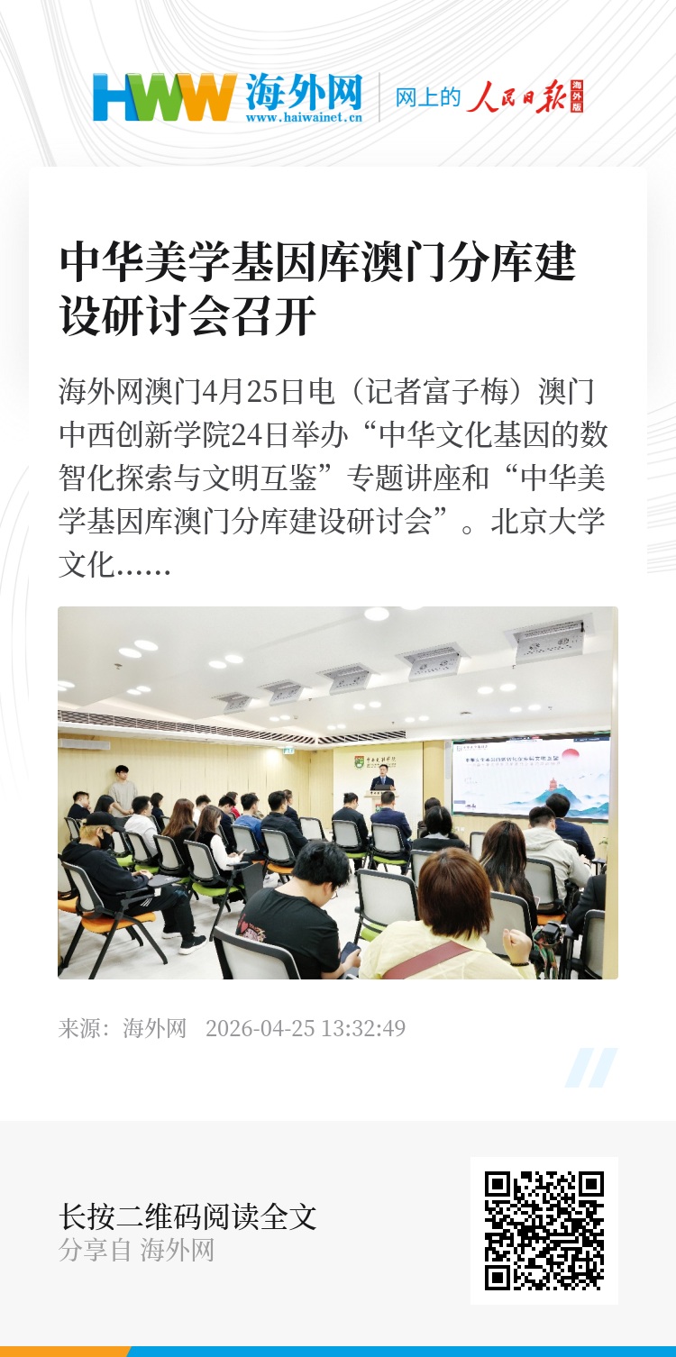 海外网澳门4月25日电(记者富子梅)澳门中西创新学院24日举办“中华文化基因的数智化探索与文明互鉴”专题讲座和“中华美学基因库澳门分库建设研讨会”。北京大学文化产业研究院院长向勇教授以“中华文化基因的数智化探索与文明互鉴——兼论中华美学基因库澳门分库的建设愿景”为题,系统阐释中华文化基因数智化转化的理论内涵、技术路径与实践方向。澳门特区政府、高校及媒体机构的多位嘉宾出席。