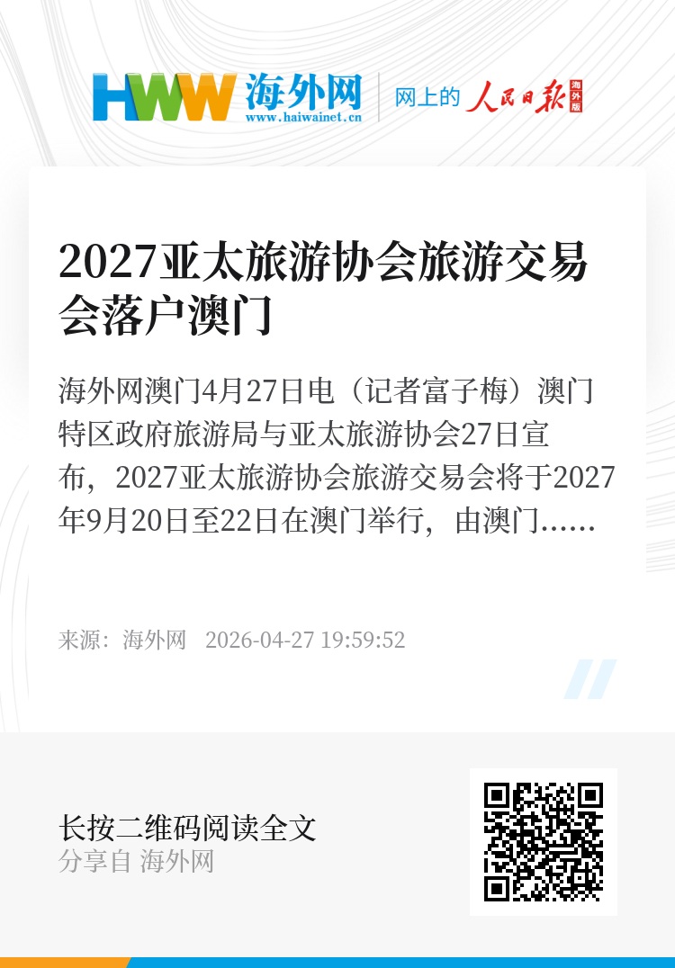 海外网澳门4月27日电(记者富子梅)澳门特区政府旅游局与亚太旅游协会27日宣布,2027亚太旅游协会旅游交易会将于2027年9月20日至22日在澳门举行,由澳门特区政府旅游局承办。这是继2010年及2017年后,该活动第三次落户澳门。届时亚太地区及世界各地的旅游官员、旅游专业人士将汇聚澳门参会。