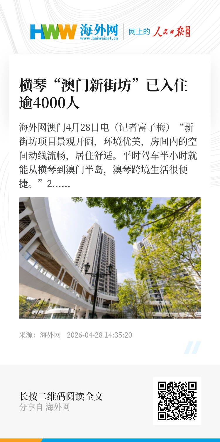 海外网澳门4月28日电(记者富子梅)“新街坊项目景观开阔,环境优美,房间内的空间动线流畅,居住舒适。平时驾车半小时就能从横琴到澳门半岛,澳琴跨境生活很便捷。”2024年9月入住“澳门新街坊”的业主许先生说,在新街坊筹划阶段已注意到此项目,并提早选好心仪户型,2023年11月28日开盘当天购置,成为首批网签业主。