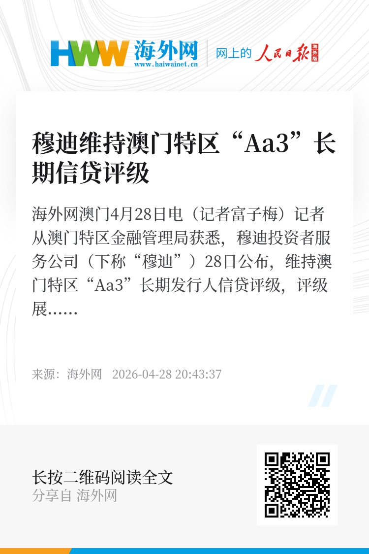 海外网澳门4月28日电(记者富子梅)记者从澳门特区金融管理局获悉,穆迪投资者服务公司(下称“穆迪”)28日公布,维持澳门特区“Aa3”长期发行人信贷评级,评级展望由“负面”调整至“稳定”。