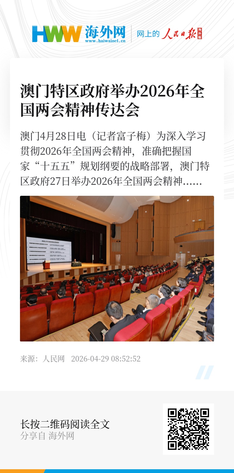 人民网澳门4月28日电(记者富子梅)为深入学习贯彻2026年全国两会精神,准确把握国家“十五五”规划纲要的战略部署,澳门特区政府27日举办2026年全国两会精神传达会,由特区行政法务司司长黄少泽、中央政府驻澳门联络办公室副主任张应杰、澳区全国人大代表团团长刘艺良和全国政协常委何润生作专题分享,约450名特区政府领导及主管官员出席。