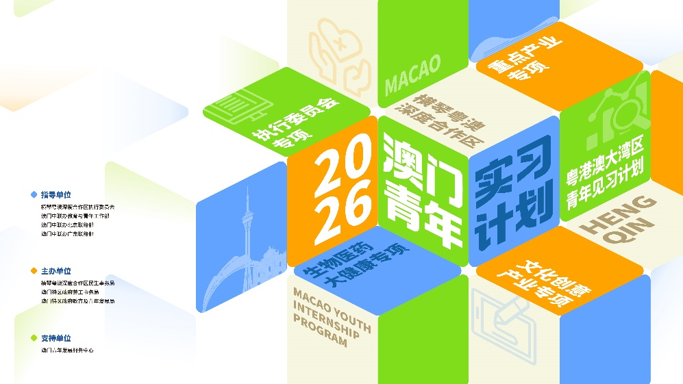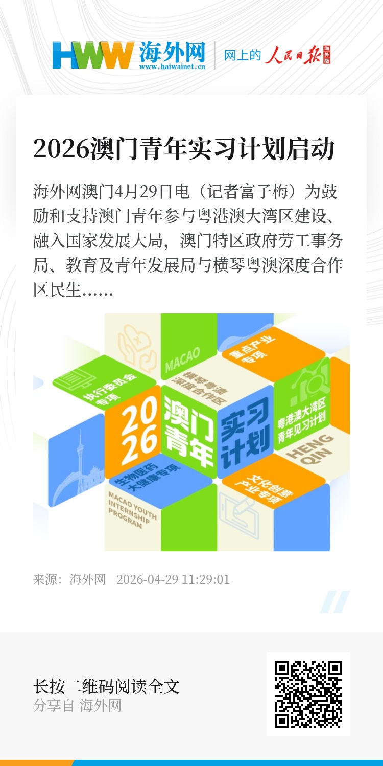 海外网澳门4月29日电(记者富子梅)为鼓励和支持澳门青年参与粤港澳大湾区建设、融入国家发展大局,澳门特区政府劳工事务局、教育及青年发展局与横琴粤澳深度合作区民生事务局联合推出2026澳门青年实习计划,率先实施的“横琴粤澳深度合作区执行委员会专项实习计划”“粤港澳大湾区青年见习计划”和“湖南影视制作实习计划”三个专项实习计划,共计招收120名澳门青年。
